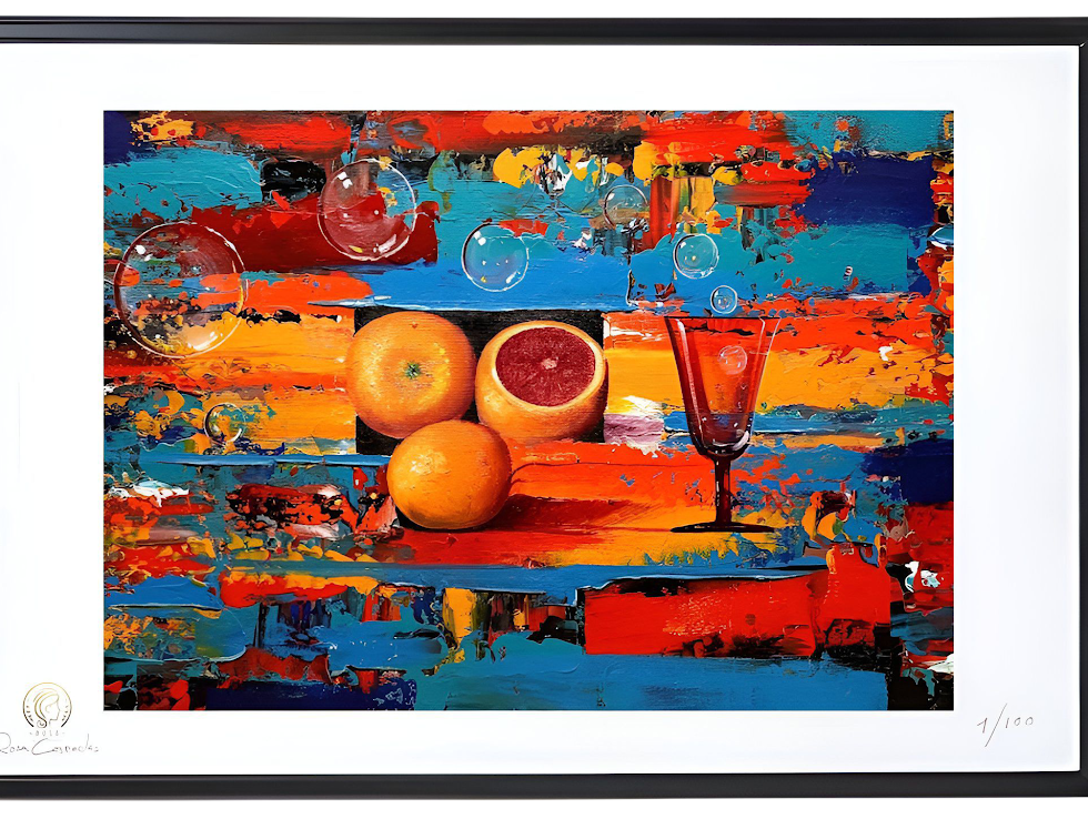 Rosa Céspedesin teos yhdistää herkullisen realismiin taipuvan hedelmäkuvauksen ja energisen abstraktin ilmaisun. Kolme appelsiinia – yksi leikattuna paljastamaan veriapelsiinin syvä punainen – kohoavat värien pyörteestä kuin aistillinen hetki keskellä juhlaa. Viinilasi ja leijuvat kuplat tuovat mukaan keveyttä ja symboliikkaa: nautinto, muisto ja hetken kauneus.