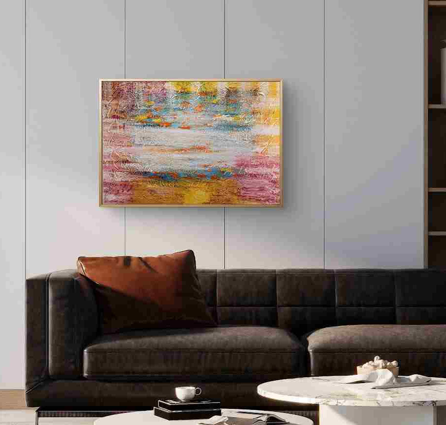 Teoksen koko 90x65 cm korostaa sen tekstuurin rikkautta ja liikkeen tuntua. Valkoiset viivakuviot rytmittävät kokonaisuutta kuin kartta, joka johdattaa katsojan sisäisen maiseman halki. Ohut musta kehys (sopimuksen mukaan) tuo esiin teoksen intensiivisyyden ja tekee siitä näyttävän elementin mihin tahansa tilaan.